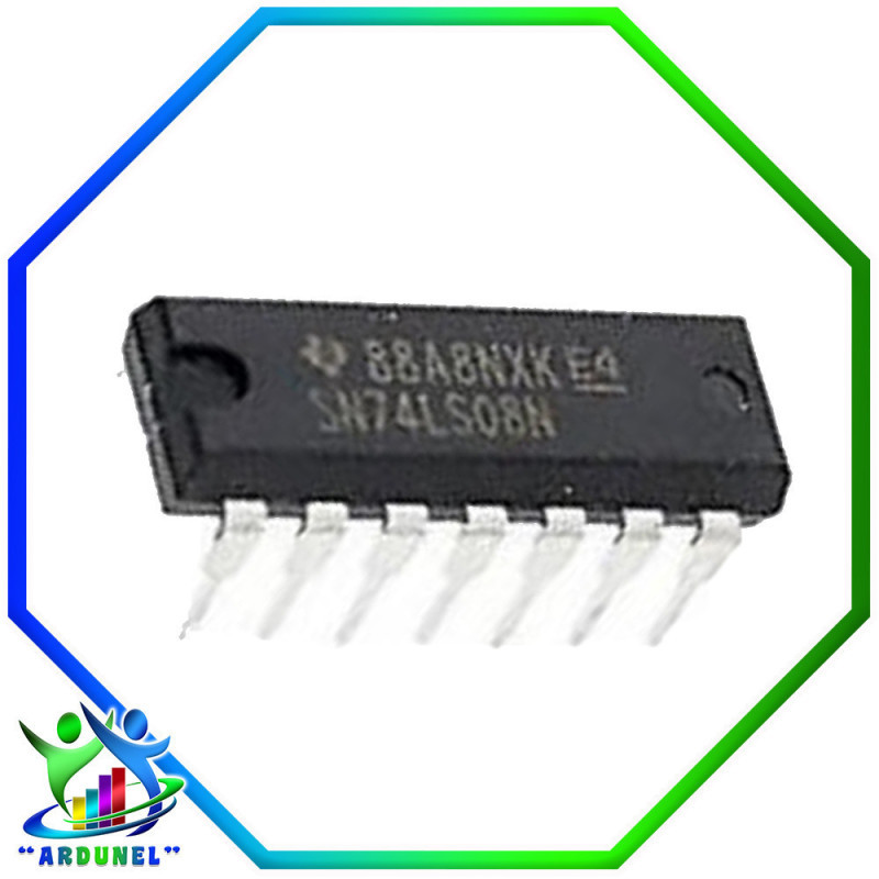 Circuito integrado con cuatro compuertas lógicas AND de dos entradas cada una, encapsulado 14DIP.