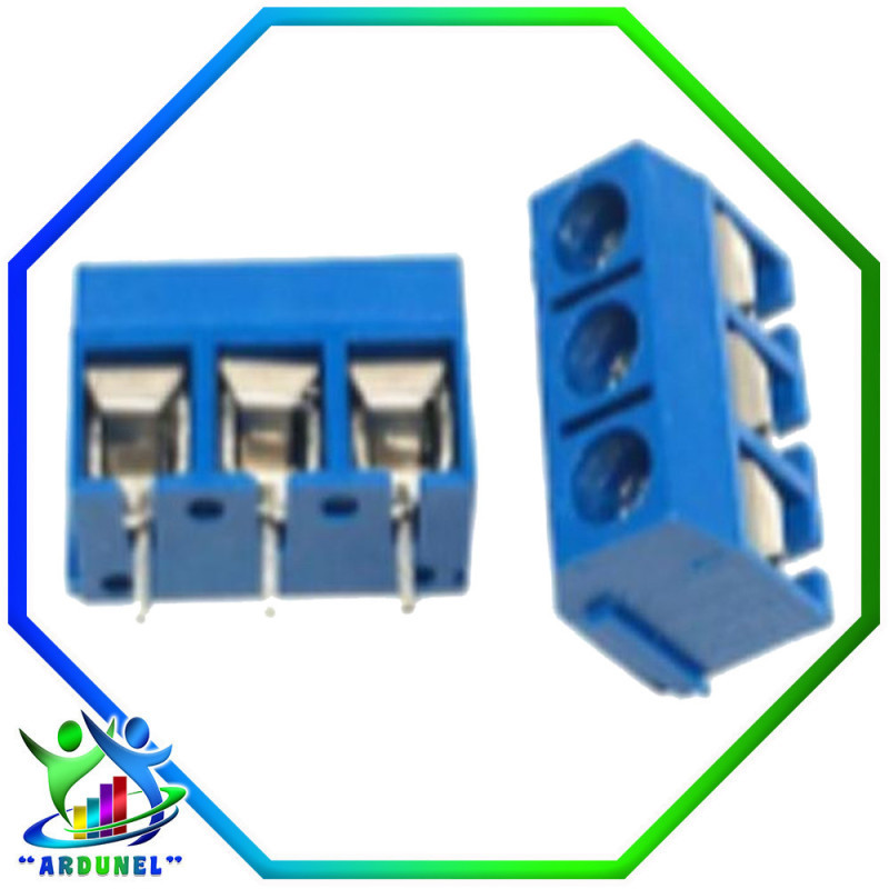 Bloques de terminales azules de 3 pines con un paso de 5,08mm aquí para sus necesidades de creación de prototipos. Los bloques de terminales son muy utiles cuando se conectan cables a sus proyectos donde es posible que no desee una conexión permanente. Este tipo de conectores permiten de una manera facil la conexión y la des-conexión de por ejemplo, un cable a una placa base. Posee tornillos que le permiten adherir el cable fuertemente al conector.